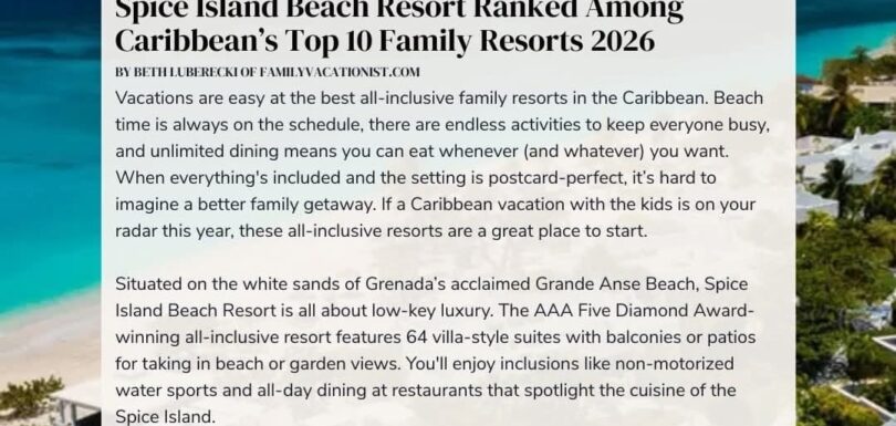 04 Mar Travel & Tourism Buzz No Comments Grenada’s Spice Isle Beach Resort Has Been Ranked Among the Caribbean’s Top 10 All- Inclusive Family Resorts for 2026 by USA Today. Continue Reading